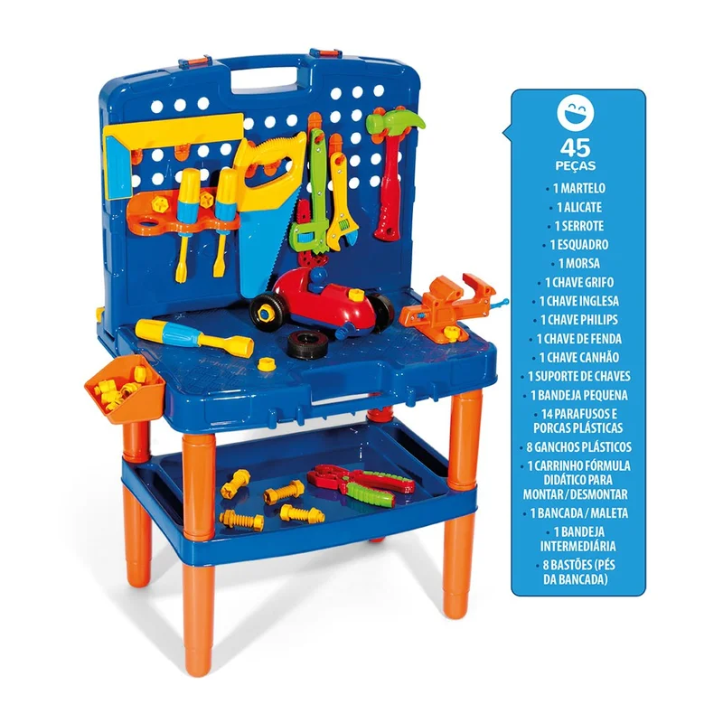 A Bancada e Maleta de Ferramentas Poliplac® é ideal para o desenvolvimento da imaginação, incentivando a descoberta e a curiosidade.