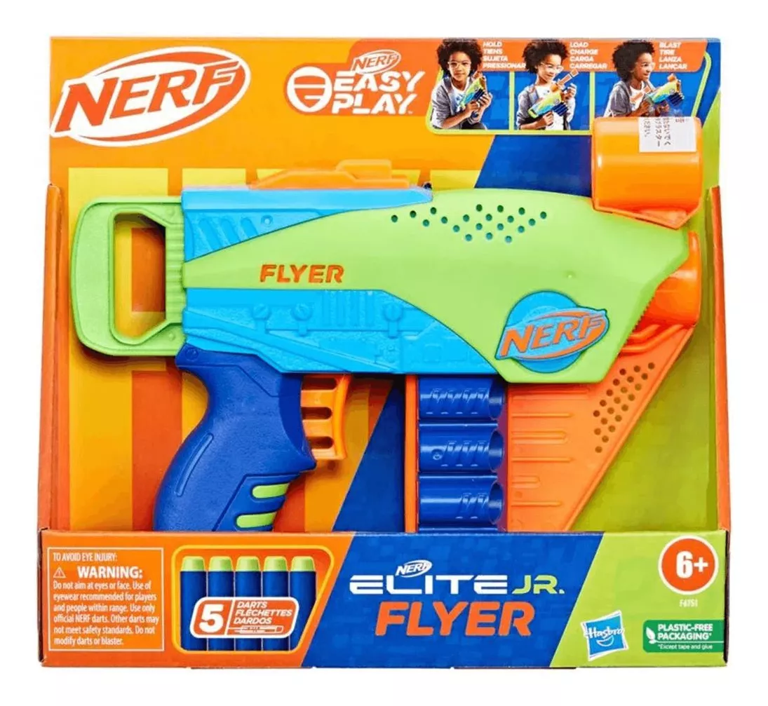 Este lançador Nerf Elite Jr para meninos e meninas possui um design fácil de brincar para que as crianças se divirtam em aventuras dentro e fora de casa. O lançador Flyer foi feito para caber confortavelmente em mãos pequenas. É leve e pode ser segurado facilmente pelas crianças. Este lançador possui a alavanca de disparo mais fácil e leve de ativar. Os dardos são facilmente inseridos no lançador. As crianças podem lançar dardos com o lançador Nerf Elite Jr Flyer e mirar através da mira de tamanho grande. Possui porta-dardos integrado para 4 dardos. É uma ótima maneira de exercitar as crianças em brincadeiras dentro e fora de casa que encorajam a atividade física e a interação social. O lançador Flyer inclui 5 dados de espuma Nerf Elite.